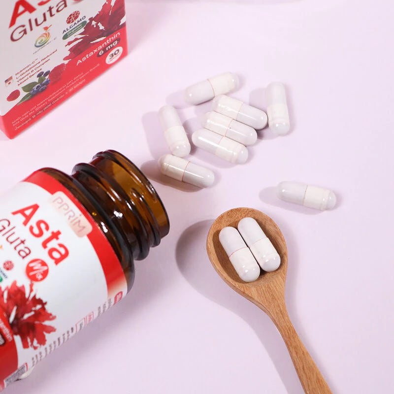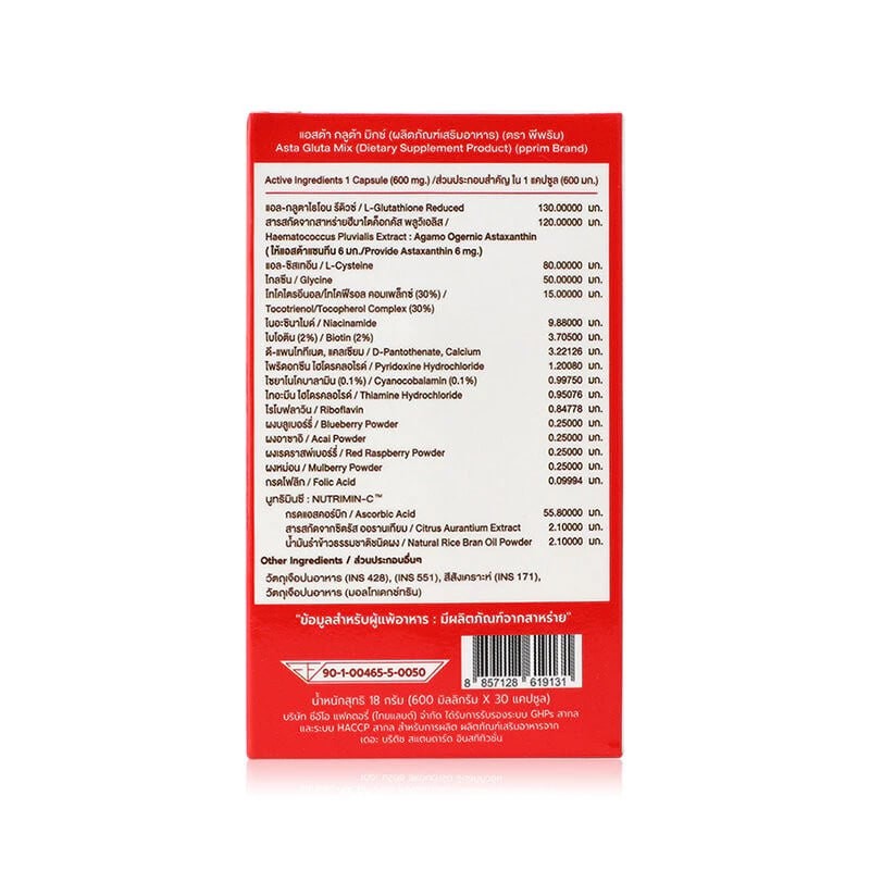 PPRIM Asta Gluta Mix 30 Capsules ผลิตภัณฑ์เสริมอาหารแอสต้าแซนธิน 6มก. ต่อแคปซูล มีทั้งวิตามิน E, B Complex และ NUTRIMIN-C