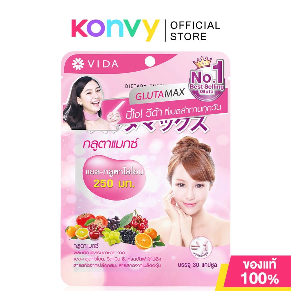 GlutaMax by Vida L-Glutathione 250mg (30 Capsules) ผลิตภัณฑ์เสริมอาหารในรูปแบบแคปซูล ที่มีส่วนประกอบจากแอล-กลูต้าไธโอน นำเข้าจากประเทศญี่ปุ่น และวัตถุดิบคัดสรร ได้แก่ วิตามินซี, กรดอัลฟาไลโปอิค, สารสกัดจากเปลือกสน, ซิงค์ และสารสกัดจากผลไม้ต่างๆ ได้แก่ ส้ม มะเขือเทศ และเมล็ดองุ่น