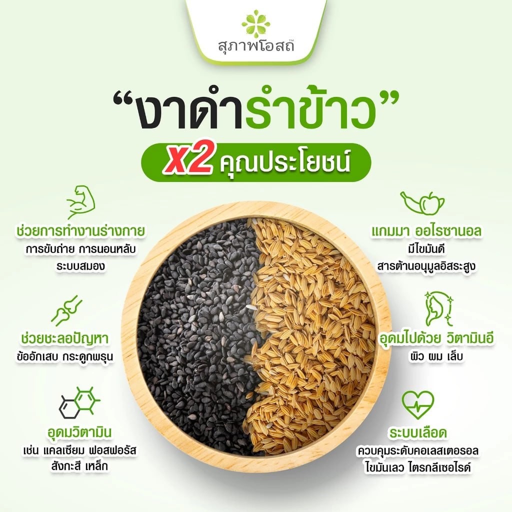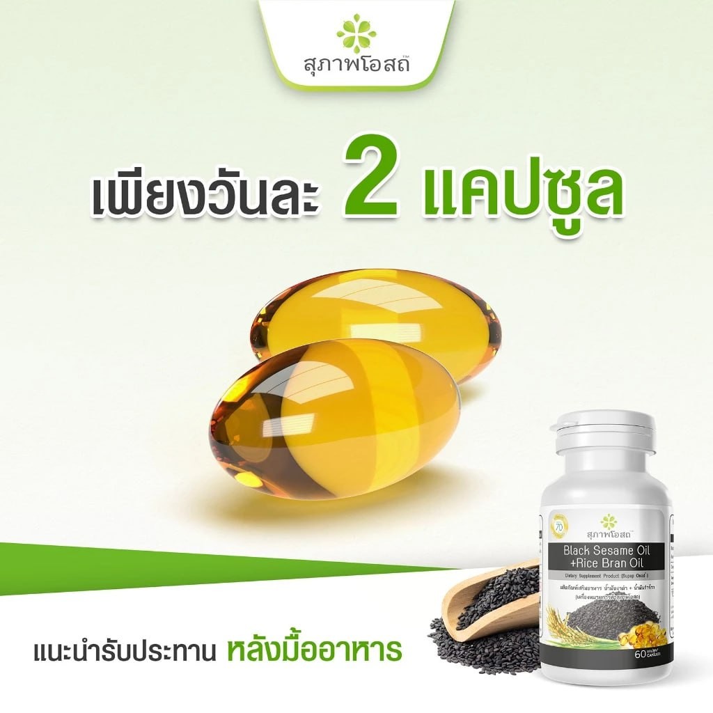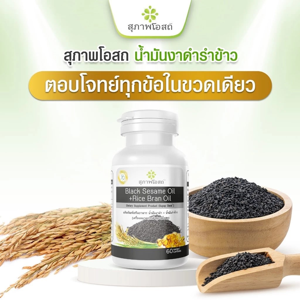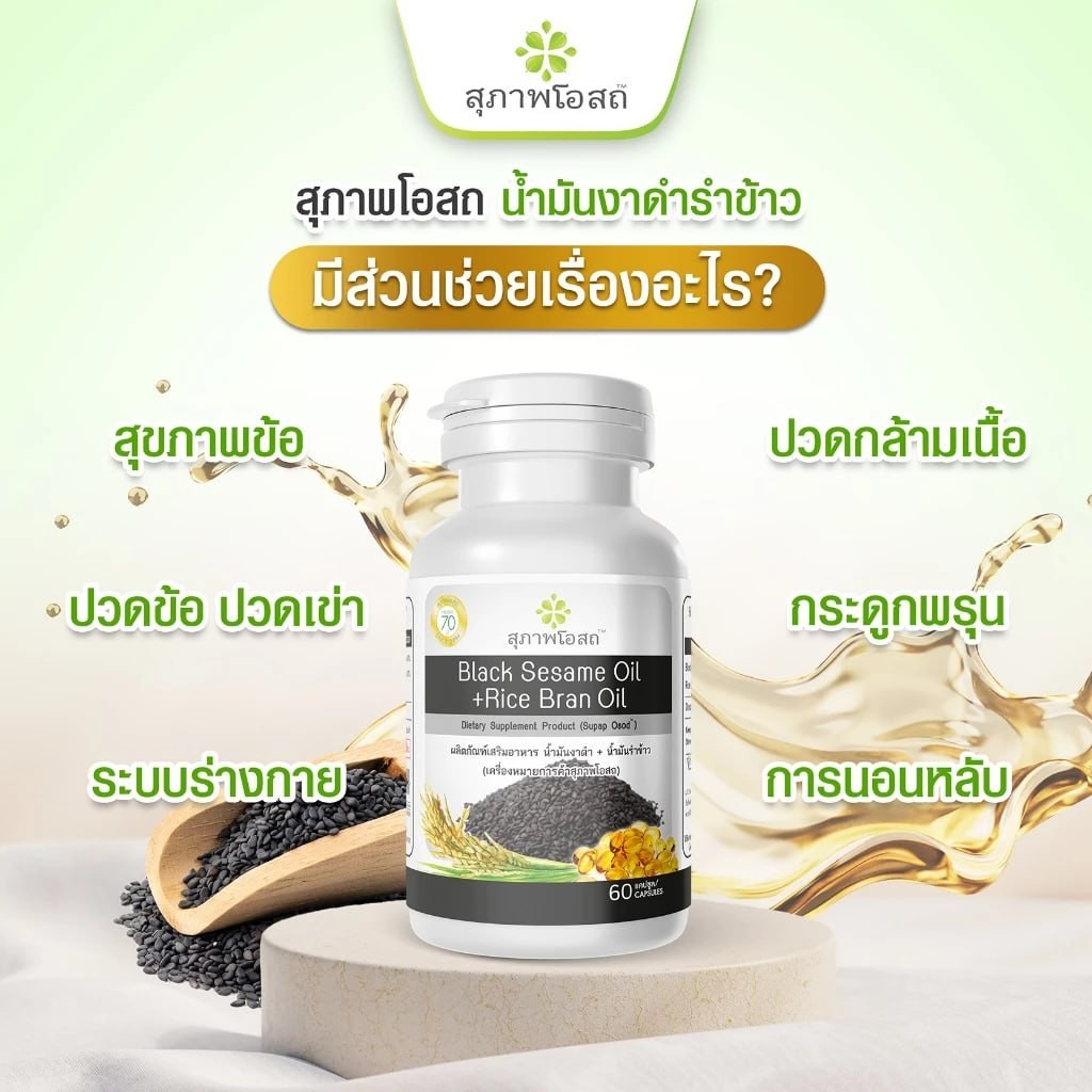 BLACK SESAME OIL + RICE BRAN OIL BSRB สุภาพโอสถน้ำมันงาดำรำข้าว 30 แคป 7 กระปุก ซึ่งสุภาพโอสถ เป็นบริษัทที่มีประสบการณ์และเชี่ยวชาญการพัฒนาผลิตภัณฑ์ อยู่คู่คนไทยมานานกว่า 70 ปี เป็นสูตรที่ปรับมาเพื่อผู้สูงอายุ หรือผู้ที่มีปัญหาเรื่องการอักเสบตามกระดูกและข้อโดยเฉพาะ อีกทั้งยังช่วยเพิ่มมวลกระดูก โดยเฉพาะผู้หญิงในวัยหมดประจำเดือนที่มีความเสี่ยงเป็นโรคกระดูกพรุน และช่วยบรรเทาอาการปวดข้ออักเสบ (โดยอัตราสูตร น้ำมันงาดำ 83% น้ำมันรำข้าว17% หรือ 5:1)