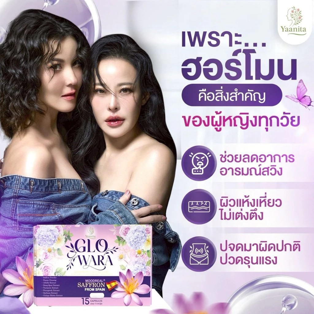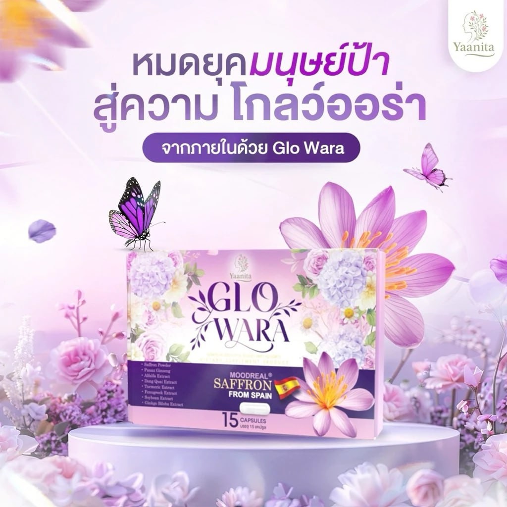 GLO WARA เป็นผลิตภัณฑ์เสริมอาหารที่ช่วยปรับสมดุลฮอร์โมนสำหรับผู้หญิงวัย 40+ มีส่วนผสมหลักจากสารสกัดธรรมชาติ 10 ชนิด เช่น โสมเกาหลี ตังกุย ขมิ้นชัน และเห็ดหลินจือ เพื่อช่วยลดอาการวัยทอง เช่น อาการหงุดหงิด นอนไม่หลับ หรืออารมณ์ทางเพศลดลง รวมถึงช่วยดูแลเรื่องประจำเดือน ผิวพรรณ และหน้าอกให้กระชับขึ้น.