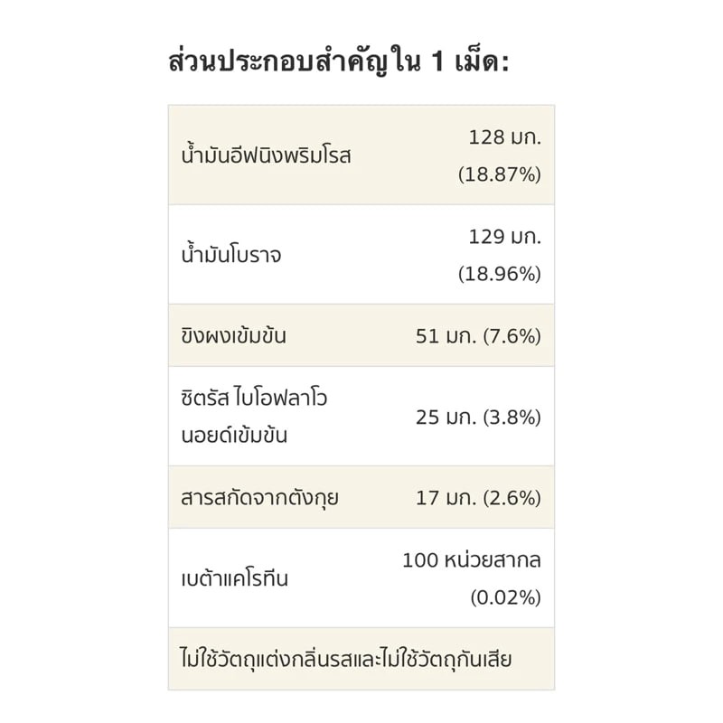 ⏩ผลิตภัณฑ์เสริมอาหารที่ประกอบด้วยส่วนผสมของน้ำมันอีฟนิง พริมโรส และน้ำมันโบราจ ที่ให้กรดแกมมาไลโนเลนิก ขิงผงเข้มข้น สารสกัดจากตังกุย รวมทั้งมีส่วนผสมของซิตรัส ไบโอฟลาโวนอยด์เข้มข้น และเบต้าแคโรทีนจากธรรมชาติ ซึ่งให้สารไฟโตนิวเทรียนท์จากธรรมชาติ