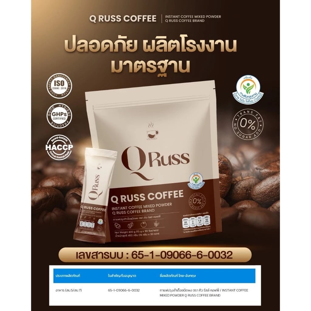 QRuss Coffee (4 ห่อ) (แถมแก้ว 1 ใบ)กาเเฟคุมหิวอิ่มนาน อร่อยกลมกล่อม เร่งระบบเผาผลาญลดการสะสมของไขมัน