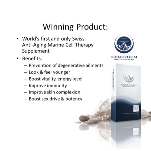 Celergen Swiss คืออาหารเสริมถูกคิดค้นให้ออกมาในรูปแบบสเต็มเซลล์แบบกิน ที่เน้นในเรื่องการรักษาลึกลงไปถึงชั้นเซลล์ หรือเป็นที่รู้จักกันในชื่อว่า “เซลล์บำบัด” เป็นวิธีการทางธรรมชาติเน้นการสร้าง ซ่อมแซม พร้อมฟื้นฟูเซลล์ และนอกจากนี้ Celergen Swiss ยังเป็นอาหารเสริมที่ช่วยกระตุ้นการผลิตโปรตีน เอนไซม์ เพื่อชะลอวัย และลบเลือนริ้วรอยบนใบหน้า รวมถึงตามจุดต่างๆ ทั่วร่างกาย