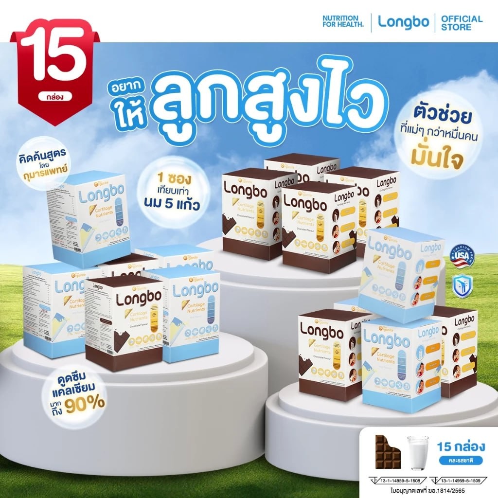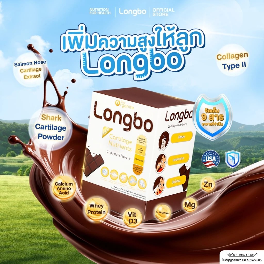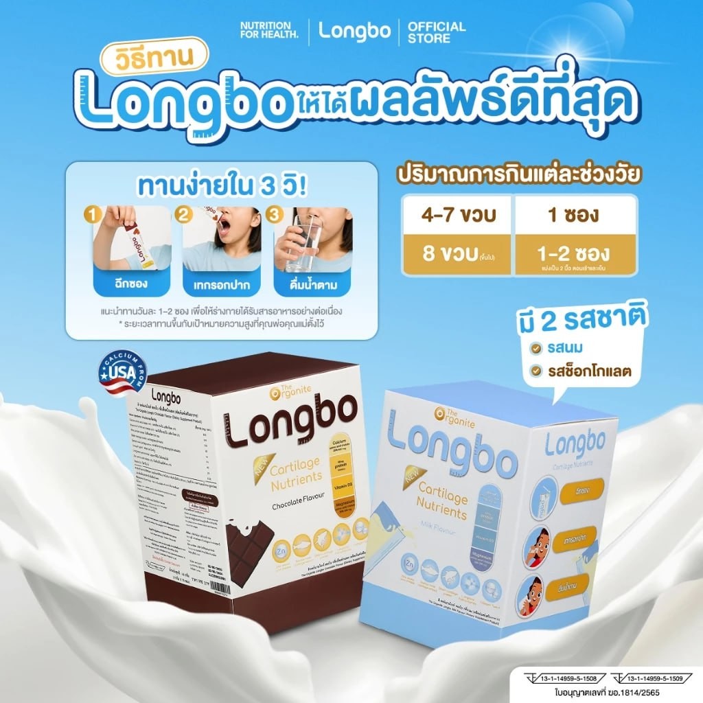 Longbo ผลิตภัณฑ์เสริมอาหารเพิ่มความสูง ชนิดผงกรอกปาก ฉีกซองแล้วเทเข้าปากไปได้เลย! มีส่วนผสทกว่า 9 ชนิด ที่ทำให้มวลกระดูกแข็งแรงและกระตุ้นการยืดของกระดูกอ่อนส่วนปลาย