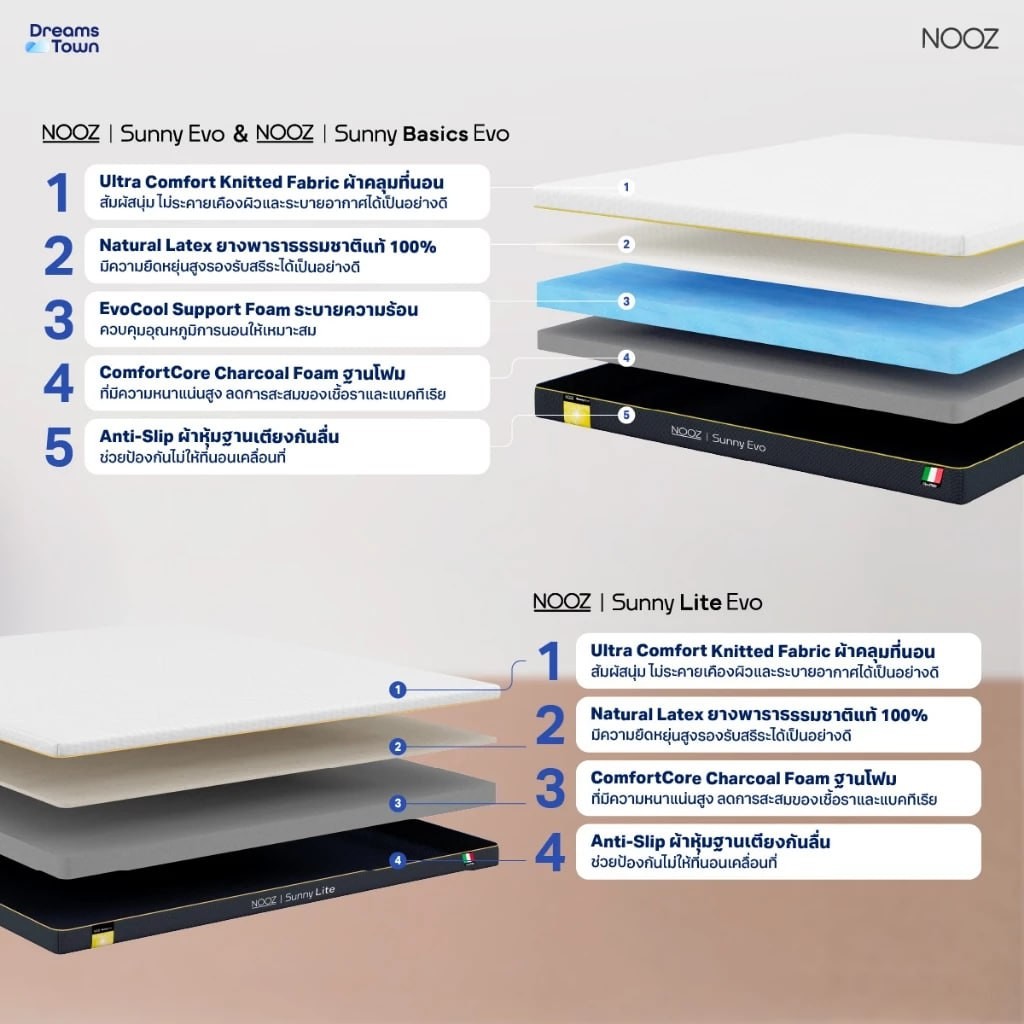 ? Nooz Sunny Evo ? ที่นอนยางพาราธรรมชาติแท้ 100% ผสานวัสดุเทคโนโลยีปรับสมดุลการนอน ช่วยรองรับสรีระได้ดีเยี่ยม ลดอาการปวดหลังจากที่นอนได้ดีเยี่ยม ช่วยจัดเรียงกระดูกสันหลังให้เป็นแนวเส้นตรง ถูกต้องตามหลักสรีรศาสตร์ ลดอาการปวดเมื่อยหลังจากตื่นนอน ทำให้การนอนหลับสบายเป็นเรื่องง่าย ๆ ที่ทำได้ทุกวันบนที่นอน Nooz Sunny Evo
