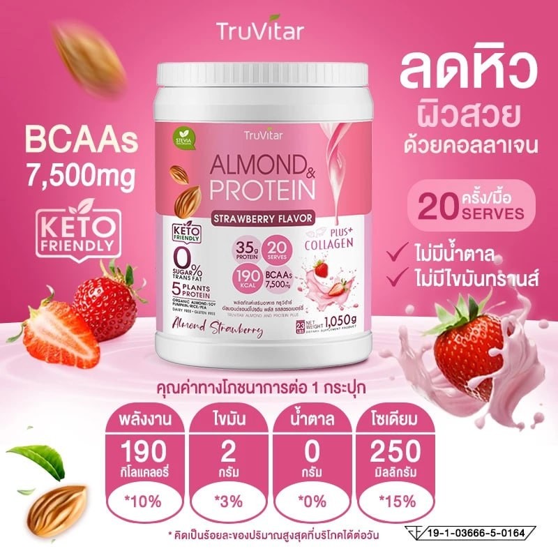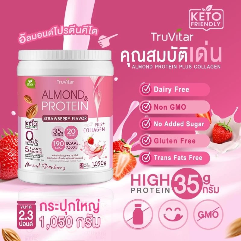 TruVitar Almond Protein Plus Collagen รสสตรอเบอร์รี่ ขนาด 1,050 กรัม โปรตีนสูง 35g กลิ่นหอม